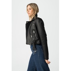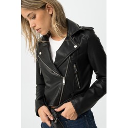 Estilo Biker Auténtico: Presenta el diseño clásico de cazadora motera con cuello de solapa y cierre frontal con cremallera. Los detalles de cremalleras metálicas en el cierre y los bolsillos aportan un toque urbano y elegante.